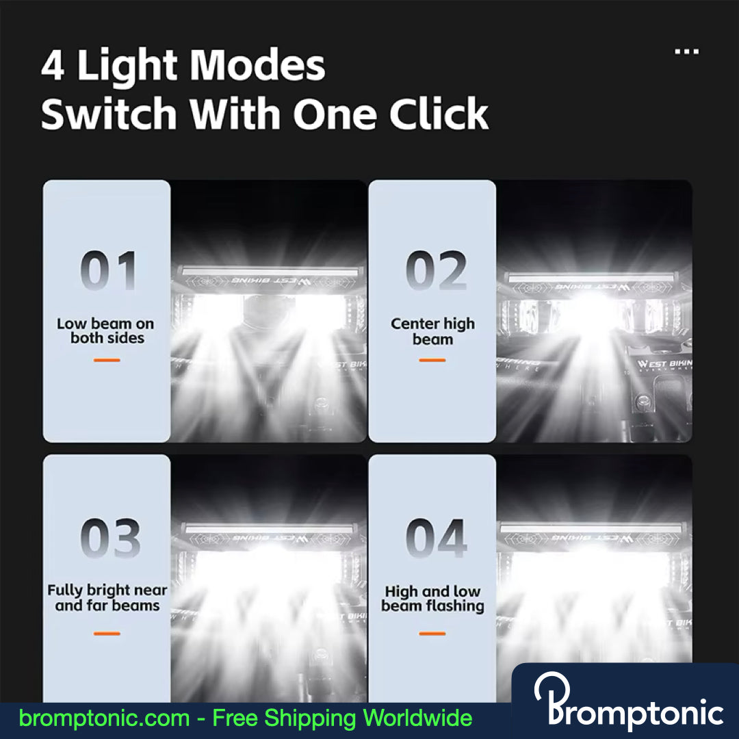• Multiple Light Modes: Includes low beam, center high beam, full brightness, and flashing modes.